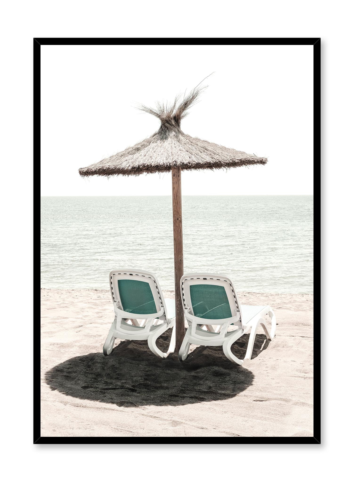 Escape to a picturesque sandy beach with this poster of chairs under a parasol facing the ocean. This art print is a must-have for all beachy decors!